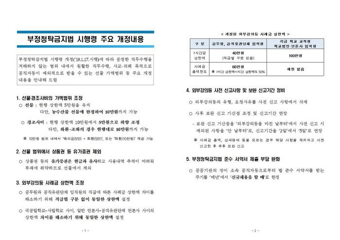 특히, 이번에 개정된 「청탁금지법 시행령」은 선물의 상한액을 5만원으로 유지하되 농수산물 선물에 한해 10만원까지 가능하며, 경조사비는 10만원에서 5만원으로 하향 조정, 선물 범위에서 상품권 등 유가증권 제외, 외부강의 사례금 조정 등을 주요 내용으로 하고 있다.
