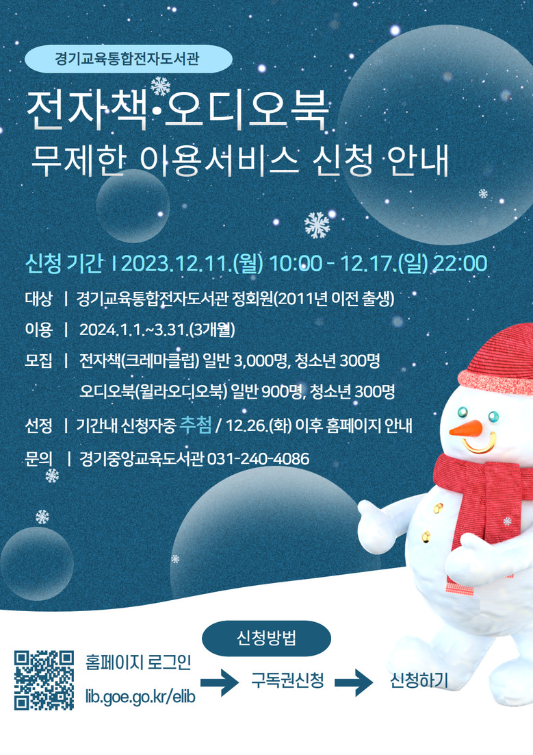신청 대상은 경기교육통합전자도서관 중학생 이상 정회원으로 추첨을 통해 ▲전자책 구독권 총 3,300명(청소년 300명, 일반 3,000명) ▲오디오북 구독권 총 1,200명(청소년 300명, 일반 900명)에게 제공한다.