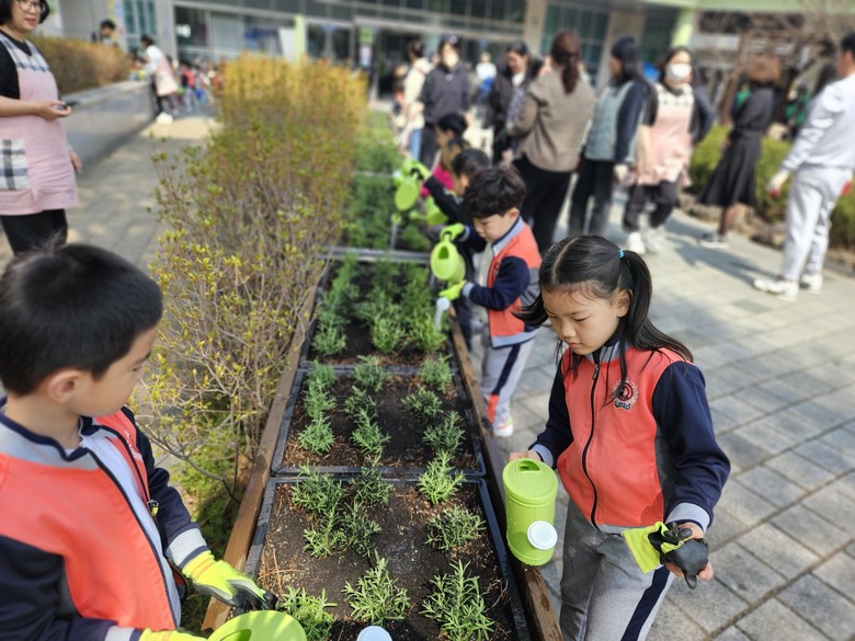 2부에서는 어린이집 원생과 도담동 마을계획단이 행정복지센터 화단에 함께 꽃을 심고, 미리 설치해둔 빗물저금통으로 모은 재이용수로 직접 물을 주는 체험을 진행했다.
