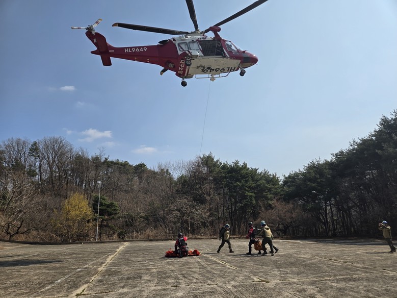 주요 훈련 내용은 ▲구조대상자 응급처치 등 실제 상황을 가정한 실전형 훈련 ▲산악구조 장비 사용법 숙달 및 소방헬기 접근 안전교육▲소방헬기 호이스트를 이용한 환자 인양 및 로프 구조 기술 고도화 훈련으로 진행됐다.