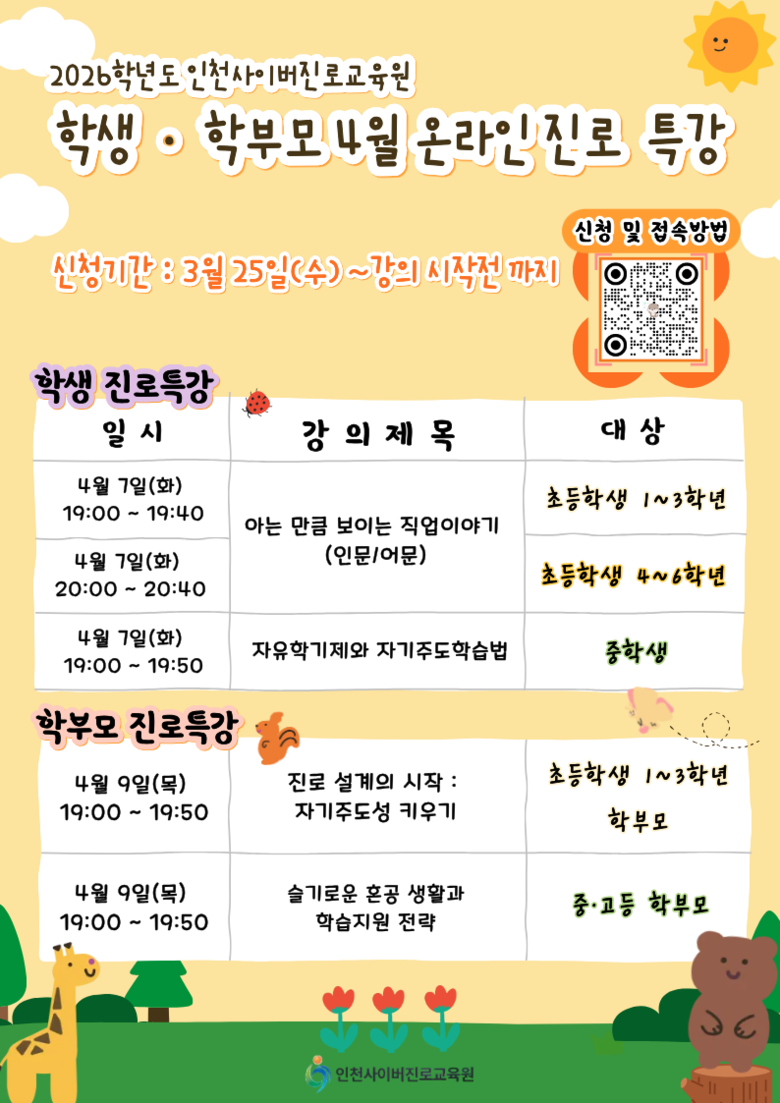 인천시교육청 관계자는 “이번 특강은 학생이 자기 이해를 바탕으로 진로 설계 역량을 키우고, 학부모는 자녀의 진로를 함께 고민할 수 있도록 지원하는 데 목적이 있다”며 “앞으로도 학생과 학부모가 함께 참여하는 진로교육 프로그램을 확대해 나가겠다”고 말했다.