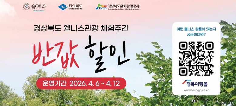 - 웰니스관광 상품 18종 50% 할인, 조기 이용 후기 이벤트도 진행 - [세계타임즈=경북 한윤석 기자] ‘2026 경북 방문의 해’를 맞아 몸과 마음을 치유하는 경북 웰니스 여행을 반값에 즐길 수 있는 특별한 기회가 열린다.