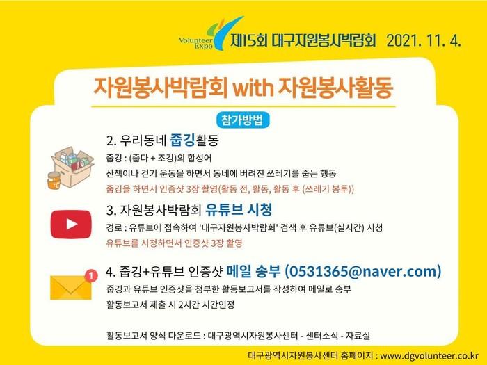아울러, 11월 12일까지 ‘대구자원봉사박람회 with 자원봉사활동’으로 대구시자원봉사센터홈페이지의 기후대응 온라인 자원봉사교육을 이수하고, 주위에 버려진 쓰레기를 줍는 활동(우리동네 줍깅) 및 자원봉사박람회 유튜브 시청 인증샷을 대구시자원봉사센터에 제출하면 자원봉사활동 시간이 2시간 인정된다.