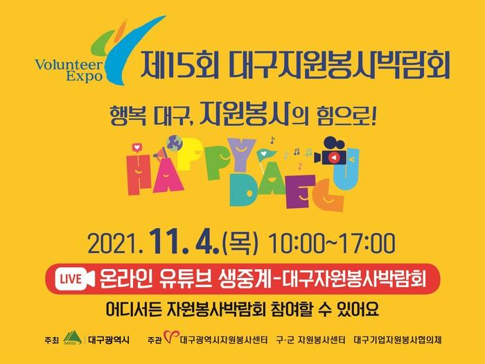 대구시가 주최하고 대구시, 구·군자원봉사센터, 대구기업자원봉사협의체가 주관하는 ‘제15회 대구자원봉사박람회’는 ‘행복 대구! 자원봉사의 힘으로!’ 라는 슬로건으로 위드코로나 가운데 일상회복 중인 시민들을 위해 자원봉사의 감동을 온택트로 즐길 수 있도록 축제의 장으로 마련됐다.