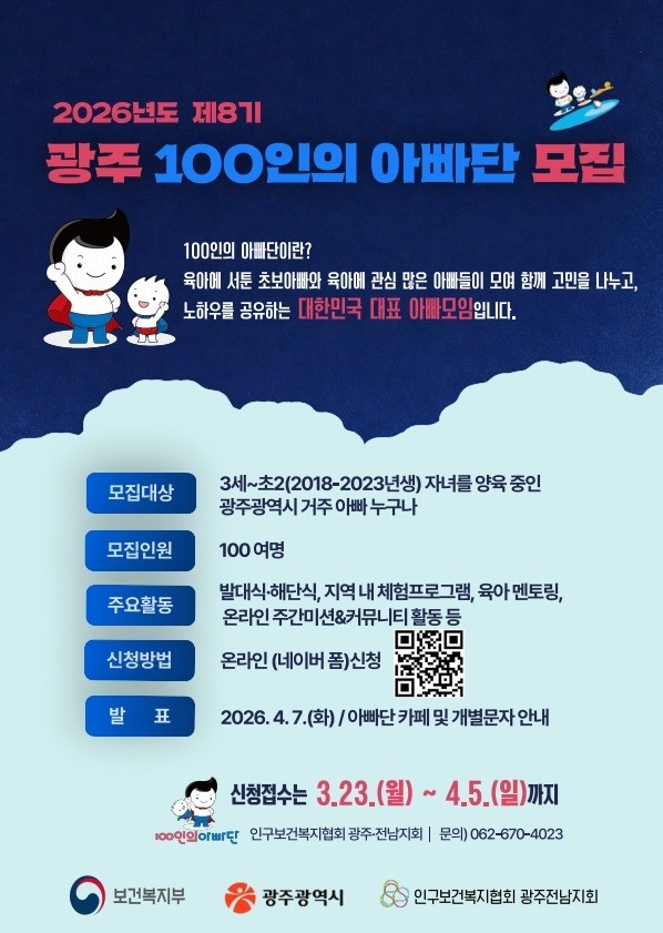 참여를 희망하는 아빠는 네이버 카페 100인의 아빠단 공식 커뮤니티 광주 게시판이나 안내문에 포함된 정보무늬(QR코드)를 통해 신청할 수 있다. 모집 기간은 3월23일부터 4월5일까지다.