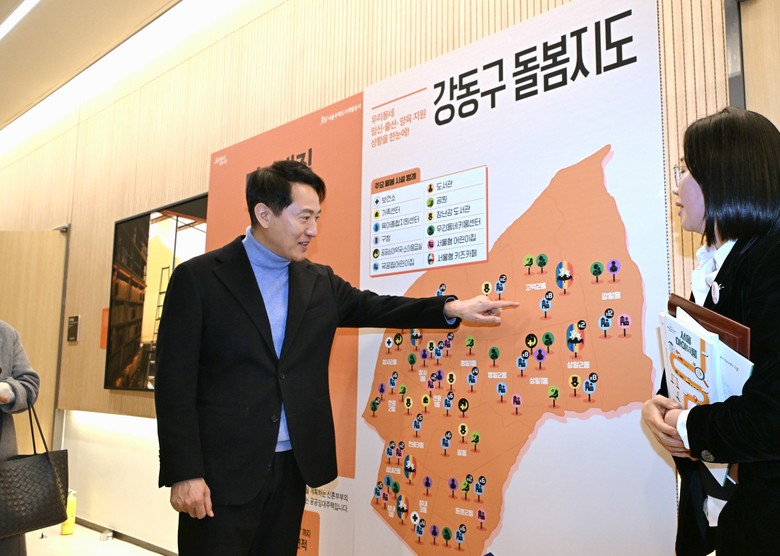 ▲ 오세훈 서울시장이 24일(토) 강동중앙도서관에서 열린 ‘서울패밀리데이’ 행사에 마련된 돌봄지도를 살펴보고 있다.