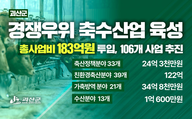 - 유통기반·자연순환·예방방역·내수면어업 4대 전략으로 현장 부담 낮춘다 [세계타임즈=괴산군 이현진 기자] 충북 괴산군(군수 송인헌)은 ‘지역과 상생하는 경쟁우위 축수산업 육성’을 비전으로 총사업비 183억원을 투입해 106개 사업을 추진한다고 22일 밝혔다.