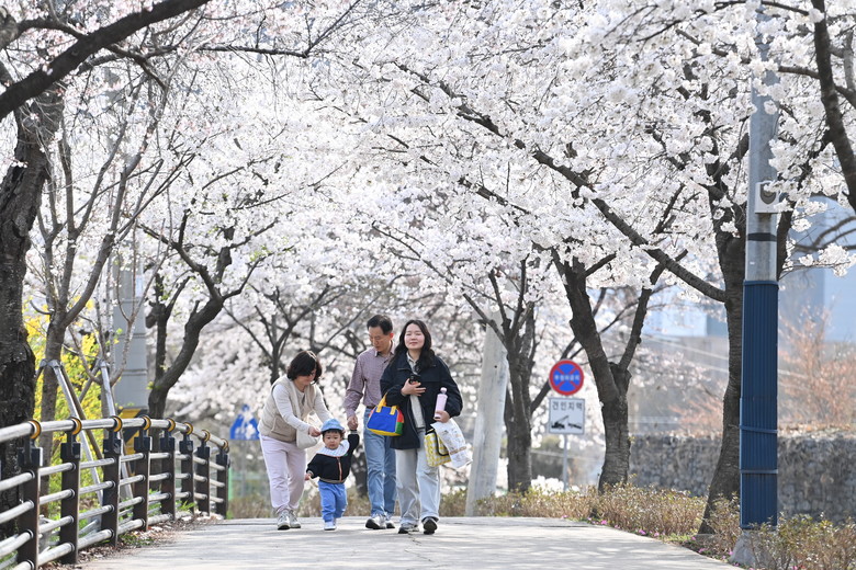 지역 주민들의 숨은 명소인 ‘신안아파트 앞 산책로’ 또한 촘촘하게 늘어선 벚꽃나무들이 하늘을 가릴 정도로 풍성하게 꽃을 피워 압도적인 화사함을 자랑한다.