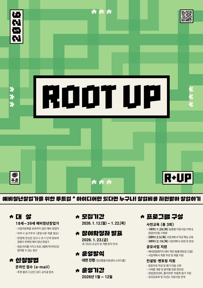 2026 예비청년창업자 지원사업 「루트업(Root Up)」관련 자세한 사항은 푸릇 블로그(http s://blog.naver.com/yjyouthcenter)를 통해 확인 할 수 있다.