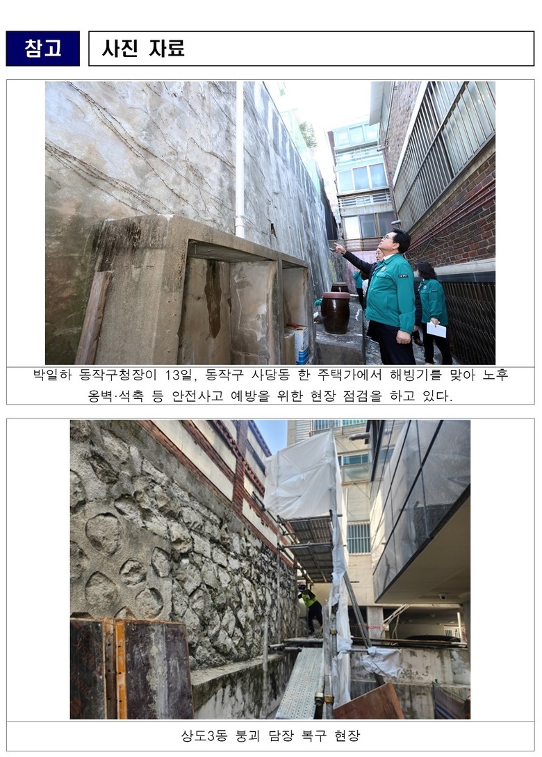 박일하 동작구청장은 “주민의 생명과 안전을 위협하는 현장에서 관리 주체를 따지며 행정이 뒷짐만 지고 있을 수는 없다”며, “앞으로도 현장에서 답을 찾고, 구민이 안심하고 살 수 있는 안전한 동작구를 만들기 위해 행정력을 집중하겠다”고 말했다.