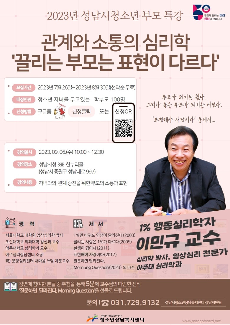 특강 신청은 7월 26일부터 선착순으로 모집하며, 성남시청소년재단 홈페이지(청소년상담복지센터>열린마당>공지사항) 및 온라인 등에서 신청 가능하다.