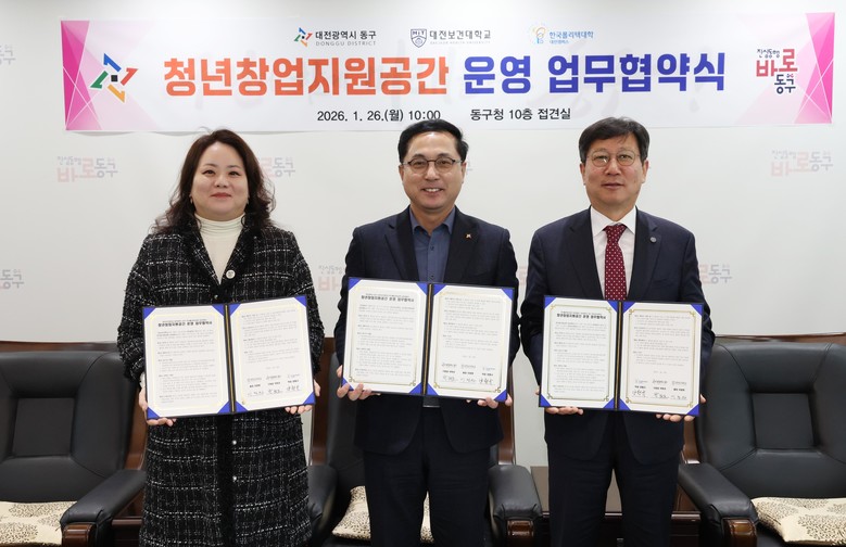 [동구 세계타임즈=이채봉 기자] 대전 동구(구청장 박희조)는 26일 대전보건대학교(총장 이정화)‧한국폴리텍Ⅳ대학 대전캠퍼스(학장 양형규)와 청년창업지원공간 운영을 위한 업무협약(MOU)을 체결했다고 밝혔다.