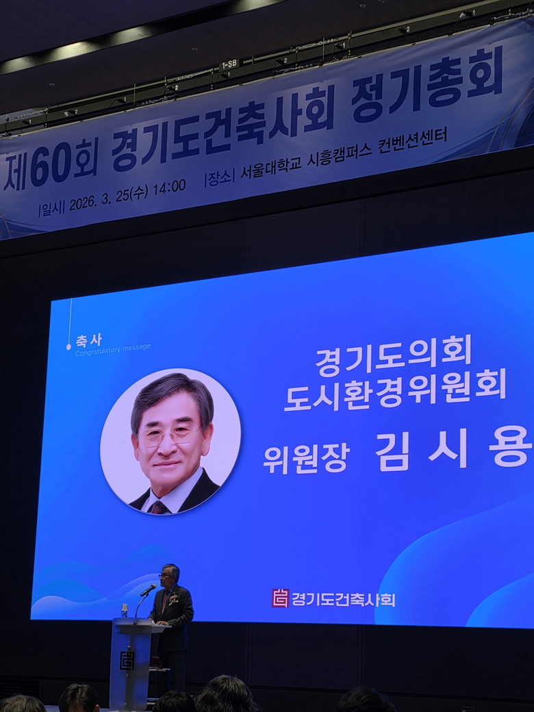 [경기도 세계타임즈=송민수 기자] 경기도의회 도시환경위원회 김시용 위원장(국민의힘·김포3)은 25일 경기도건축사회 제60회 정기총회에 참석해 건축 분야 발전을 위해 헌신해 온 관계자들에게 감사와 격려의 뜻을 전했다.