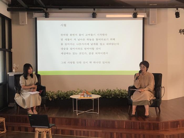 참석자들은 시인과 함께 책 속의 시를 낭독하면서 시인의 등단 과정과 시 쓰기 작업, 시인의 시 세계에 대한 이야기를 들었다.