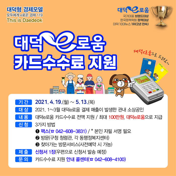 [대덕구=세계타임즈 이채봉 기자] 대전 대덕구(구청장 박정현)는 19일부터 5월 13일까지 코로나19 장기화로 어려움을 겪고 있는 소상공인 고통분담과 경영안정을 위해 올해 1월~3월 동안 지역화폐 대덕e로움으로 결제된 매출 카드수수료 전액을 지원한다고 18일 밝혔다.