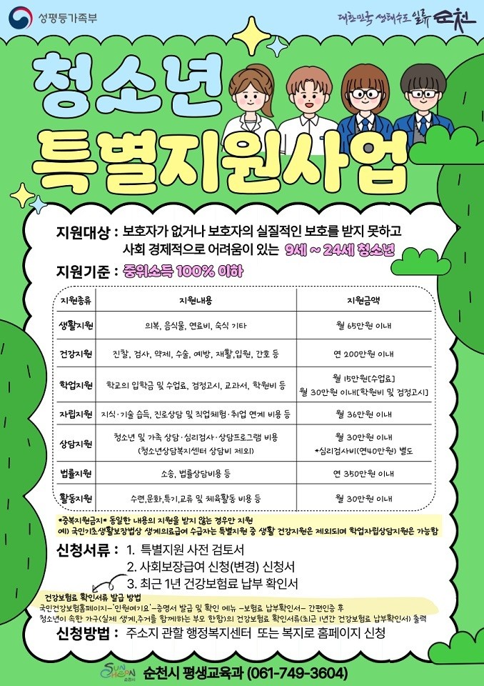 신청 방법은 주소지 관할 읍·면·동 행정복지센터 방문 또는 ‘복지로’ 누리집에서 신청할 수 있으며, 기타 문의사항은 순천시 평생교육과 (061-749-3604)를 통해 안내받을 수 있다.