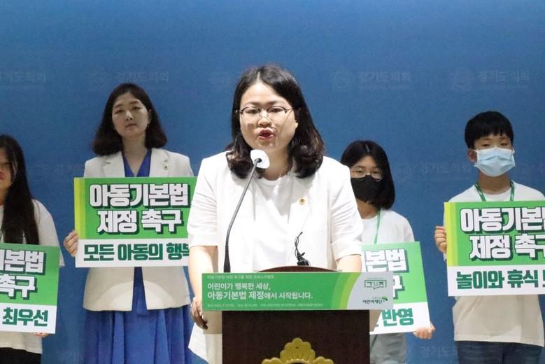 경기도의회 교육행정위원회 이자형 의원(더불어민주당, 비례)은 27일 경기도의회 브리핑룸에서 초록우산 어린이재단 아동권리옹호단 <그린즈>와 함께 아동기본법 제정을 촉구하는 기자회견을 진행했다.