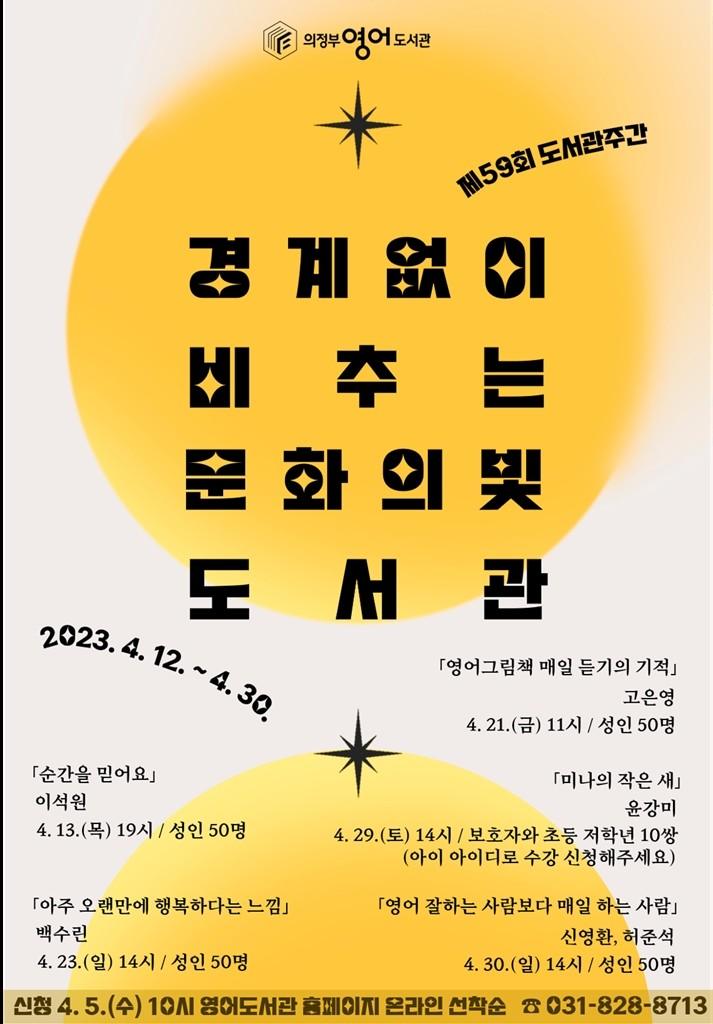 이번 제59회 도서관 주간은 「경계 없이 비추는 문화의 빛, 도서관」이라는 표어를 걸고 영어와 문학 분야의 작가를 초청해 강연회를 개최한다.