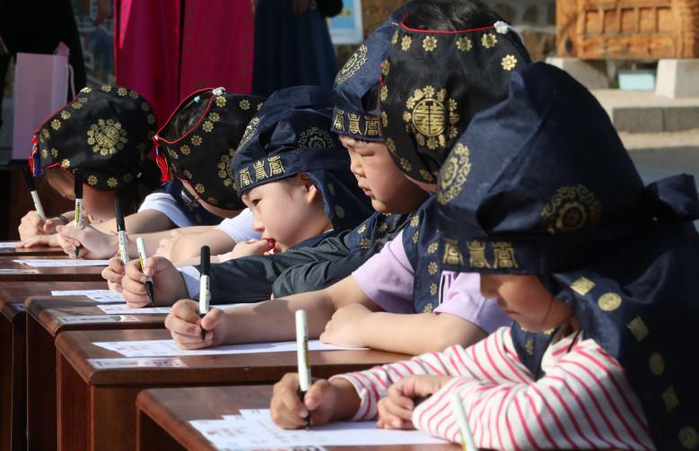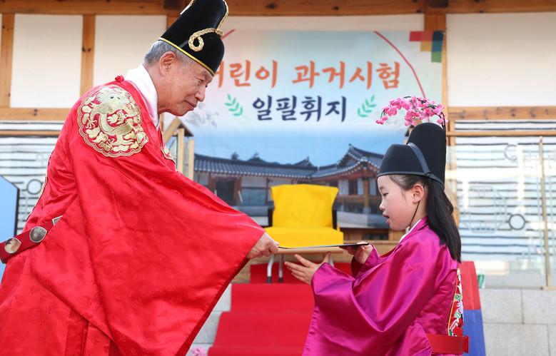 유생 복장을 한 어린이 참가자들이 한옥 앞마당에 앉아 글쓰기 솜씨를 뽐내며 장원 급제에 도전했다. 장원 급제한 학생에게는 어사화를 수여하며 전통 행사의 묘미를 살렸다.