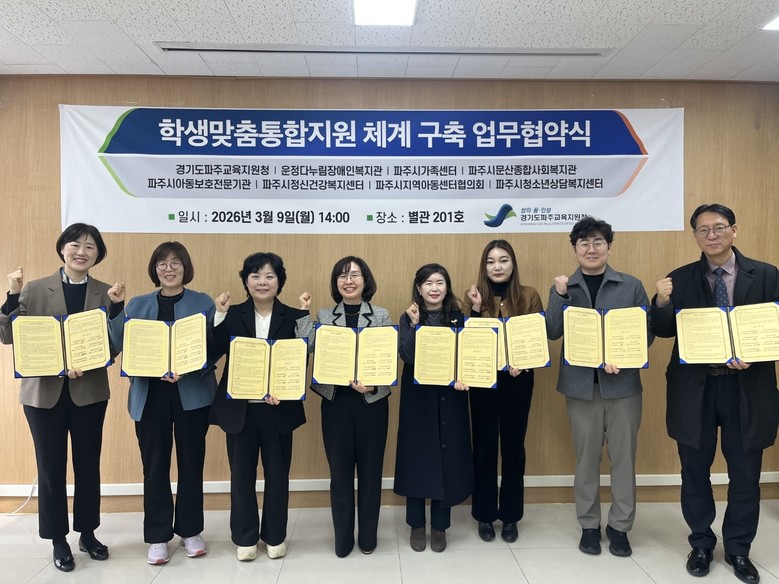 [파주시 세계타임즈=송민수 기자] 경기도파주교육지원청(교육장 전선아)은 3월 9일(월), 복합적인 위기 상황에 놓인 학생을 위한 맞춤형 통합 지원체계 구축을 위해 관내 7개 지역기관과 함께 업무협약을 체결했다.