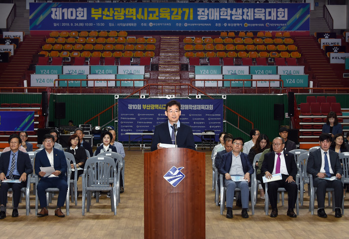 [부산=세계타임즈 장경환 기자] 전영근 부산광역시교육청 교육국장이 24일 오전 10시부터 동래구 사직실내체육관에서 김광모 부산시의회 교육위원회 위원장과 추연길 부산시장애인체육회 수석부회장, 초.중.고.특수학교(급) 학생, 지도교사 등 1,200여명이 참석한 가운데 열린 ‘제10회 부산광역시교육감기 장애학생체육대회’에서 인사말을 하고 있다.