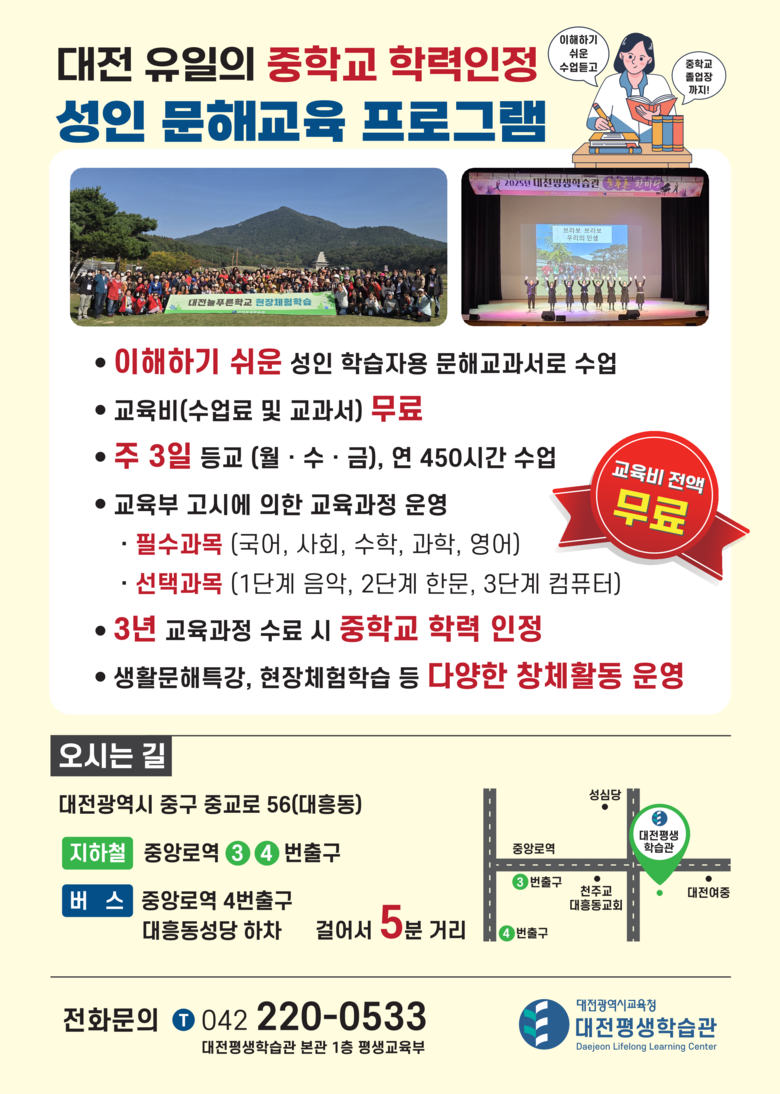 - 중학교 졸업 학력인정, 교육비 전액 무료 - [대전 세계타임즈=이채봉 기자] 대전평생학습관은 2026년 2월 13일까지 2026년 대전늘푸른학교 중학교 학력인정 과정 신입생을 모집한다고 밝혔다.