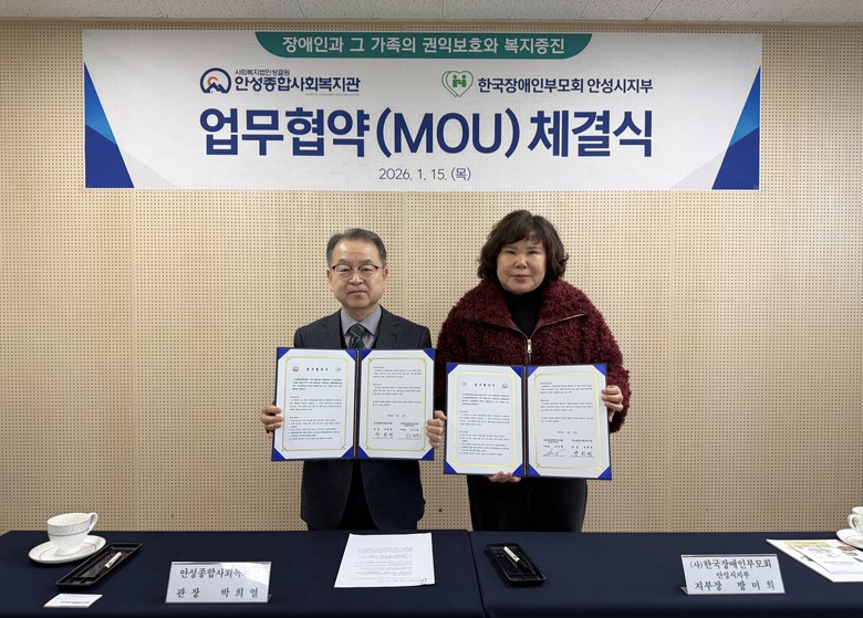 [안성시 세계타임즈=송민수 기자] 안성종합사회복지관(관장 박희열)은 지난 15일 (사)한국장애인부모회 안성시지부(지부장 방미희)와 장애인·가족 권익 보호 및 복지 증진을 위한 업무협약(MOU)을 체결했다.