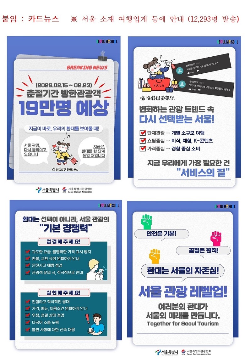 설 명절과 중국 춘절을 맞아 서울 등산관광센터와 서울마이소울샵에서 기념 환대 이벤트를 운영하고, 기념품 증정과 할인 혜택으로 관광 만족도와 소비 활성화를 도모한다.