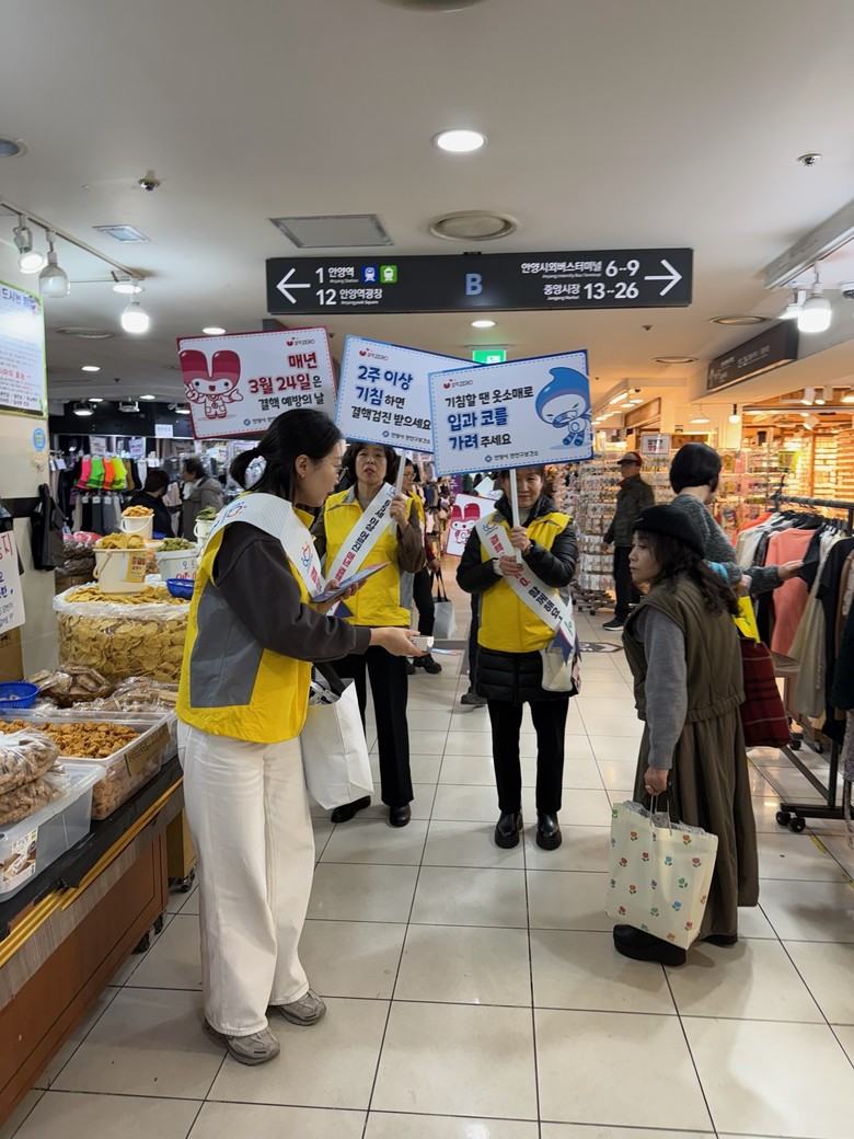 동안구보건소는 24일 범계역사 내에서 ‘기침=신호, 검진=보호, 치료=야호’ 등 다양한 슬로건을 내걸고 대시민 홍보를 펼쳤다. 보건소는 결핵 조기 발견의 중요성뿐만 아니라 에이즈 예방, 올바른 손 씻기, 심뇌혈관질환 관리, 헌혈 동참 등 다양한 감염병 및 만성질환 예방 정보를 통합적으로 안내했다.