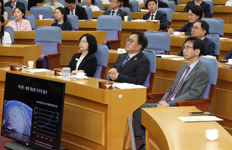 우원식 국회의장(앞줄 가운데)이 19일 서울 여의도 국회 의원회관에서 열린 '국회최고위, 기후위기와 인구위기' 세미나에서 강의를 듣고 있다. 2025.6.19