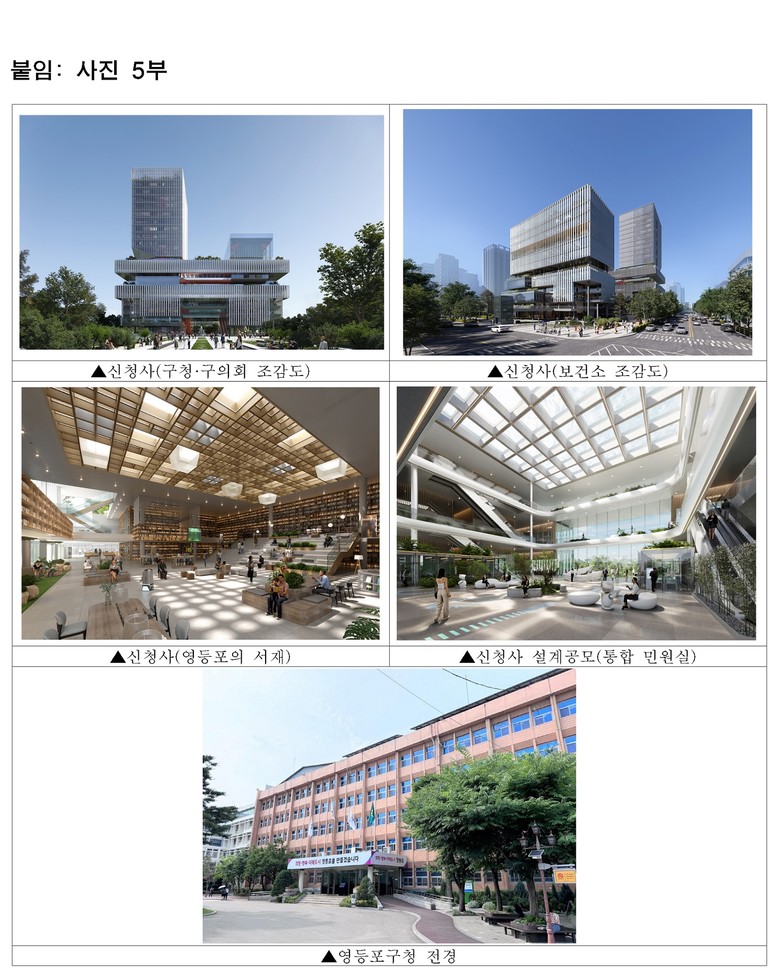 또한 교통의 중심지이자 주거지역, 여의도 업무지구, 준공업지역, 문화예술 공간이 어우러진 영등포의 도시적 특성을 반영해 주변 환경과 조화를 이루는 미래지향적 건축으로 계획됐다. 다양한 생활권이 만나는 지점에 자리한 신청사는 주민과 행정이 함께 숨 쉬는 열린 공간으로, 도시와 자연, 일상과 행정을 잇는 새로운 거점이 될 것으로 기대된다.