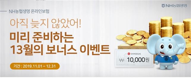 미리 준비하는 13월의 보너스이벤트는 NH농협생명 온라인보험 홈페이지에서 참여 가능하다. 이벤트 경품은 2회분 보험료가 납입된 이후인 2020년 1월 10일(2019년 11월 중 계약건), 2020년 2월 14일(2019년 12월 중 계약건)에 대상자 휴대폰으로 발송된다.
