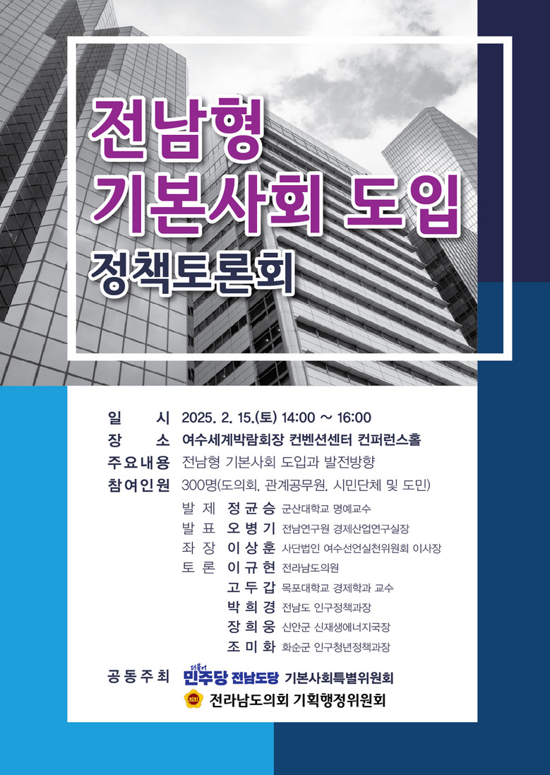 이번 토론회는 전남형 기본사회 시범사업의 안정적인 도입을 위한 의견수렴과 정책제언을 통해 전남형 기본사회로의 이행을 촉진하고자 마련되었다.