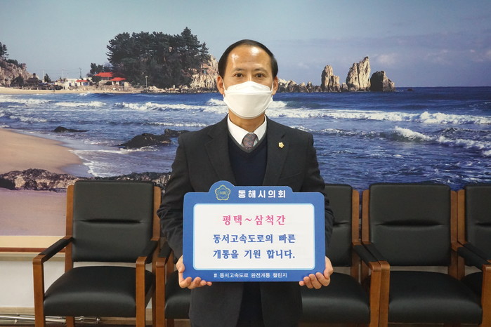 [동해시=세계타임즈 김민석 기자] 김기하 동해시의회 의장이 22일 평택~삼척간 동서고속도로 완전개통을 염원하는 챌린지에 동참했다.