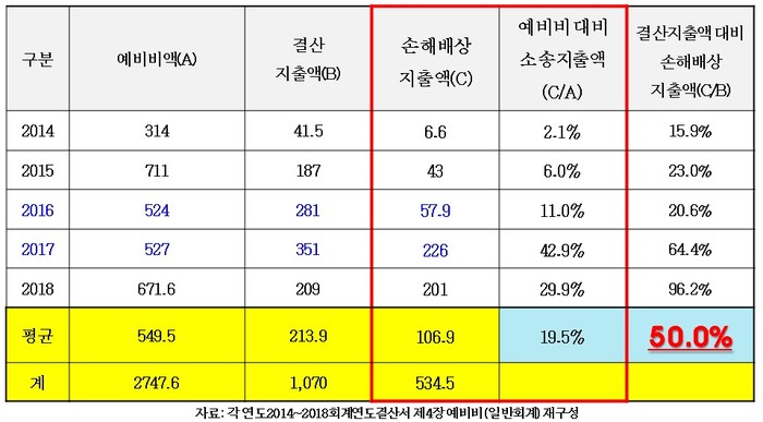 이 의원은 승소율이 85.3%에 달하면서도, 소송비용이 과도하게 증가한 점에 대해서도 지적했다. 패소로 인해 발생한 손해배상액이 지난 5년간 총 534억 5천만원으로 연평균 107억원에 이르렀고 대부분이 예비비로 지출되었다. 즉 소송 패소로 인한 손해배상액이 예비비 지출액의 50% 이상을 차지했다. 이 의원은 예비비 대부분이 손해배상액으로 지출되는 문제점을 지적하며 예비비의 성격이 원래 손해배상액이 목적이 아님을 꼬집었다.