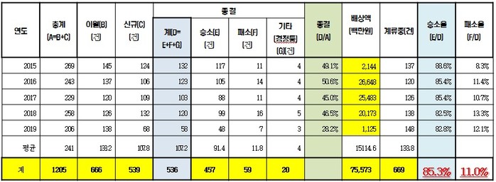 ❖ 승소율 85.3%, 그런데 손해배상액 연평균 107억원?