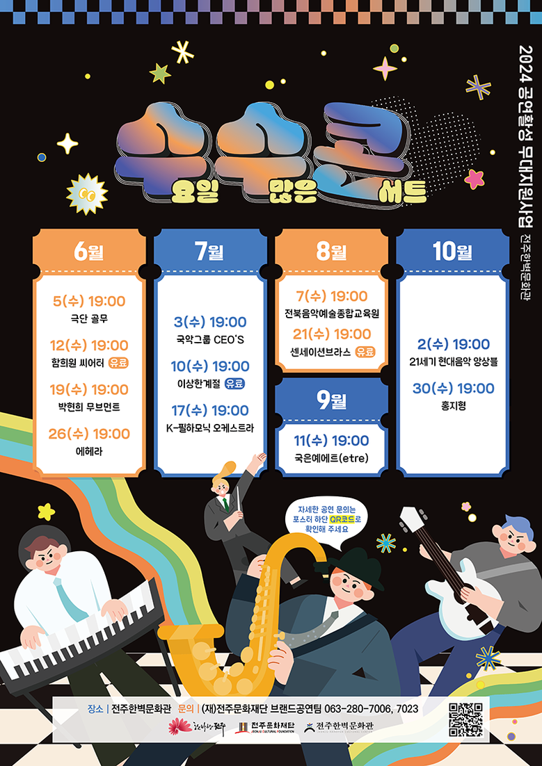 [전주한벽문화관=세계타임즈 이상호 기자] 전주한벽문화관 2024 공연활성 무대지원사업 <수요일 수많은 콘서트>는 지난해 10개 단체(5장르)를 지원했던 것에 비해 12개 단체(7장르)로 확대하여 전주 문화예술인·단체의 실연기회를 확대하는 동시에 공연장의 활성화를 꾀한다.