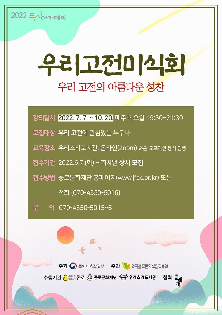 - 7월 7일부터 10월 20일까지 우리소리도서관과 줌(ZOOM)으로 참여할 수 있어… 비용 무료 [세계타임즈=종로구 이장성 기자] 종로구가 고전 읽기를 통해 과거와 현재를 연결하는 특별한 시간 「우리고전미식회」를 선보인다.