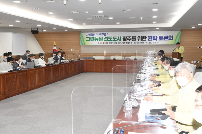 광주광역시의회 그린뉴딜특위(위원장 김광란)와 광주시는 7일(수) 오후 2시부터 광주시, 시민단체, 대학, 기업, 연구소 등과 함께 ‘그린뉴딜 선도도시 광주를 위한 원탁토론회’를 개최했다.