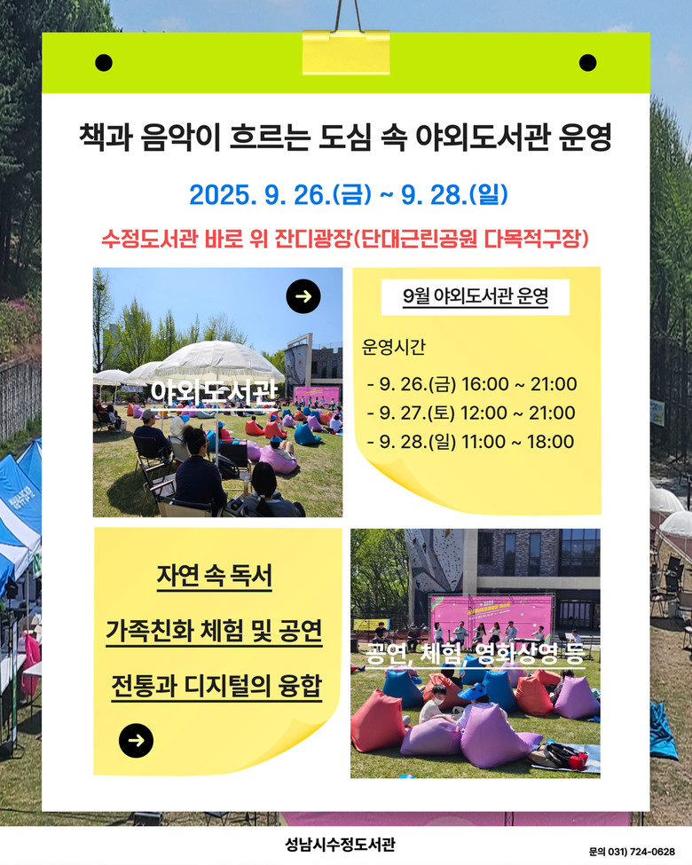 한편, 야외도서관은 우천 시 실내 행사로 전환되며, 세부 일정은 수정도서관 홈페이지 및 SNS를 통해 확인할 수 있다.