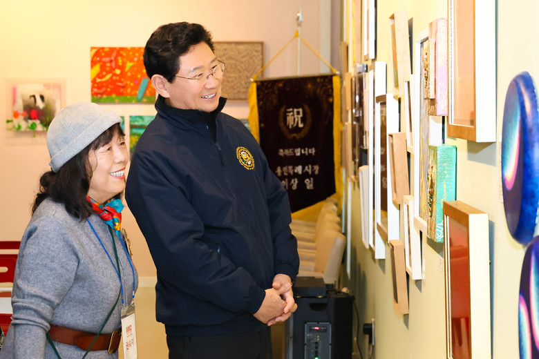 | ▲이상일 용인특례시장이 20일 '권숙자안젤리미술관'에서 열린 '1004 아름다운 동행' 자선전 행사에서 지역의 예술가들이 전시한 작품을 보고 있다.(사진=용인시) |