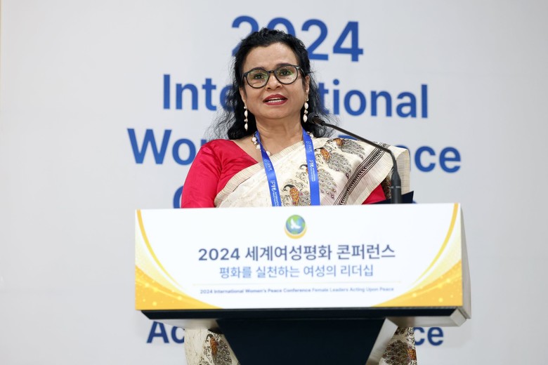 | ▲19일 경기도 가평군 소재 켄싱턴리조트에서 열린 ‘2024 세계여성평화 콘퍼런스’에서 아가사 수실라 안토니 디아스(Ms. Agatha Sushila Anthony Dias) 암차 가르(Amcha Ghar) 설립자가 오픈마이크 세션에서 발언하고 있다. (제공: IWPG) |