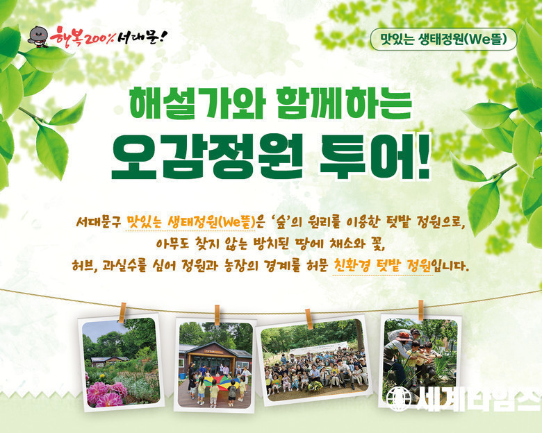 [세계타임즈=신상철 기자] 서대문구(구청장 이성헌)가 건전한 여가선용과 도심 속 힐링의 기회를 제공하기 위해 ‘맛있는 생태정원 We뜰’(송죽길 60)에서 ‘해설가와 함께하는 오감정원 투어’를 추진한다.