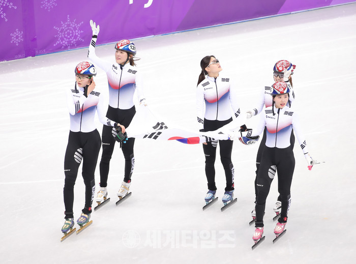 20일 강릉아이스아레나에서 열린 쇼트트랙 스피드 스케이팅 경기에 고양시청 소속 김아랑 선수가 메달사냥에 나섰다. 이날 김아랑 선수는 1000m 예선 통과와 더불어 3000m 계주에서 금메달을 목에 걸며 관중들로부터 응원의 박수를 받았다. 사진은 금메달 확정 후 쇼트트랙 계주 여자 대표팀이 관중들 응원에 화답하는 모습.