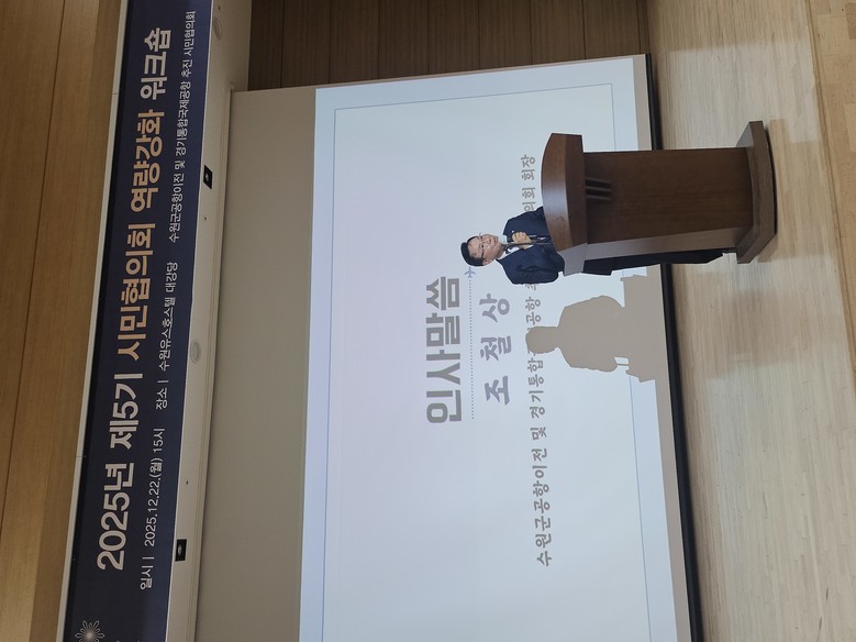 이번 워크숍은 ▲유공 시민 포상 및 신규 임원 위촉 ▲전문가 강연 ▲2025년 활동 성과 및 2026년 사업계획 보고 ▲활동 방향 분과별 토론 ▲수원 군공항 이전 결의 퍼포먼스 순으로 진행됐다.
