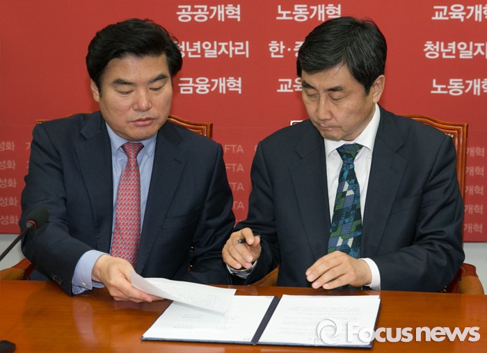 (서울=포커스뉴스) 원유철(왼쪽) 새누리당 원내대표와 이종걸 새정치민주연합 원내대표가 2일 오전 서울 여의도 국회에서 열린 예산안 및 법안 처리 관련 회담을 마친 뒤 합의문 서명을 하고 있다.