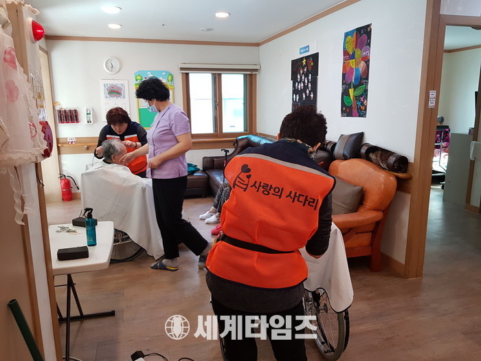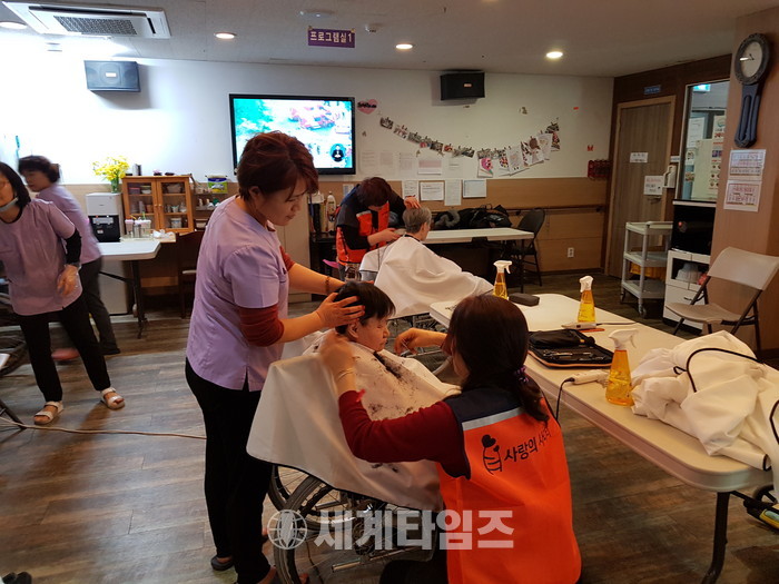[대전=세계타임즈 이장성 기자] 6천명 봉사단체인 SNS 밴드모임 사랑의 사다리 밴드(리더 이정제)는 7일 오전10시 대덕구 비래동에 위치한 실버케어노인요양원(원장 김숙희)에서 치매 및 와상 어르신들 50분께 미용봉사로 사회적 효행을 실천하였다