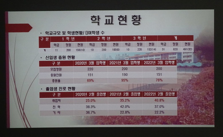 게다가 신입생 충원에 실패하면 학급 수를 줄이고 교사를 감원할 수밖에 없는 상황에서 학교 관계자를 격려하고, 발전 방안 마련에 힘을 모아보자는 취지이다.