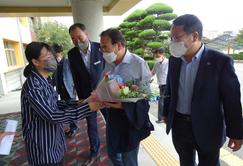 | ▲박지은 이리공고 학생회장이 서거석 전북도교육감에게 꽃다발을 전달하고 있다 |