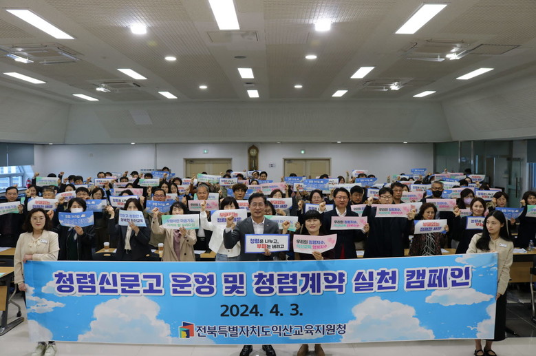 [익산=세계타임즈 이정술 기자] 전북특별자치도익산교육청(교육장 정성환)은 2024. 4. 3.(수) 3층 회의실에서 관내 행정실장 100여명을 대상으로 2024년 계약업무 운영 개선 방안 행정실장 회의를 개최하여 '청렴신문고' 운영 특강을 진행하고, 청렴계약 실천을 강화하는 캠페인을 전개했다.
